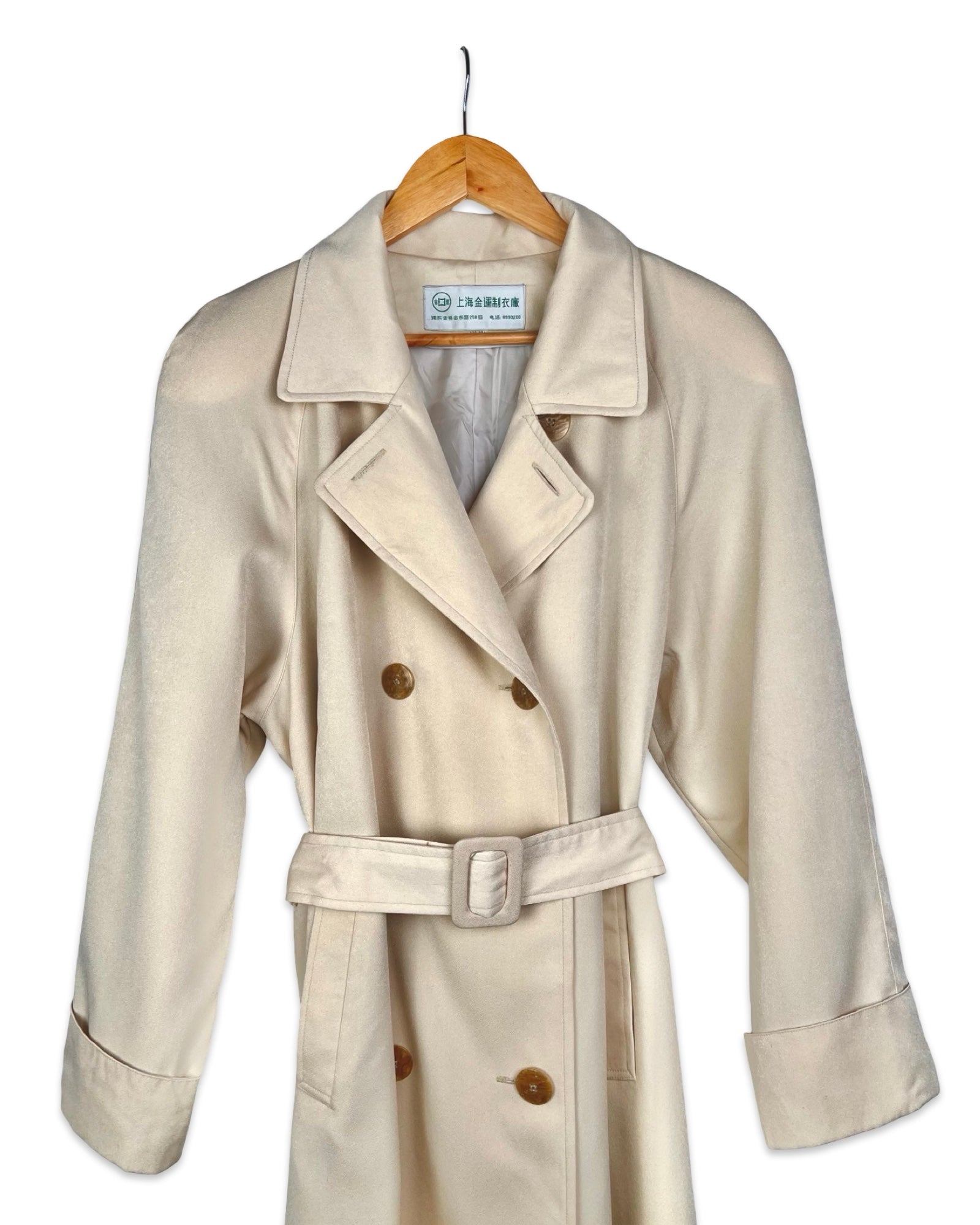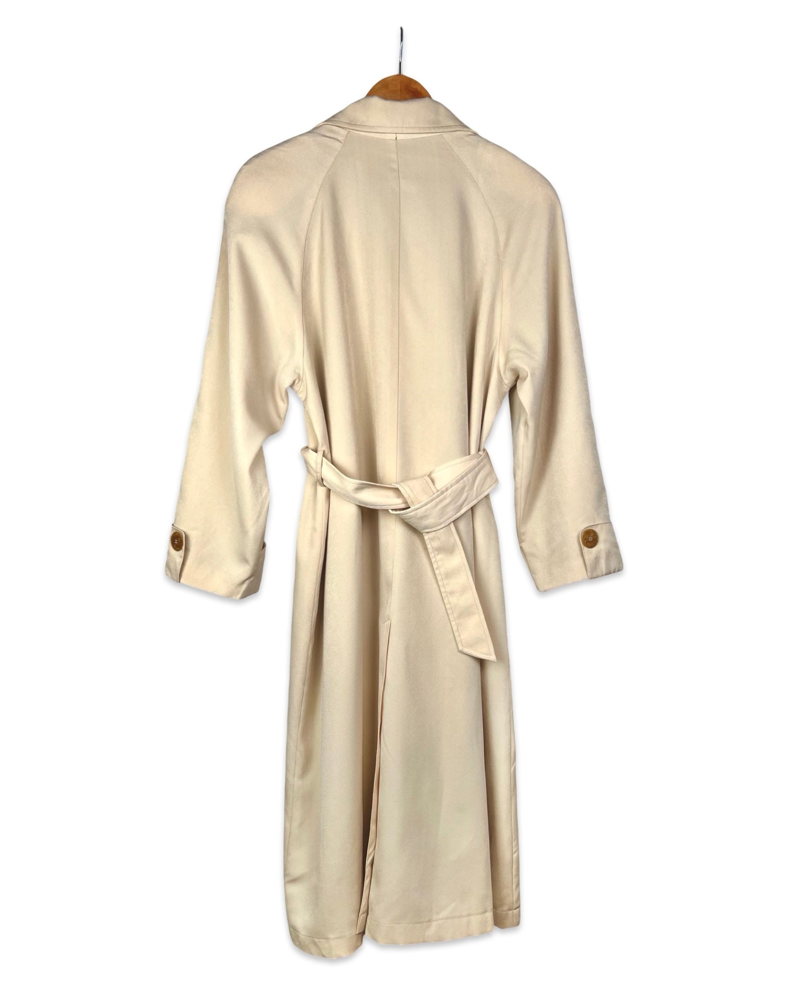 Classic vintage double-breasted trench coat in a chic cream color, made of a softly flowing fabric. The coat has raglan sleeves and a matching belt at the waist.