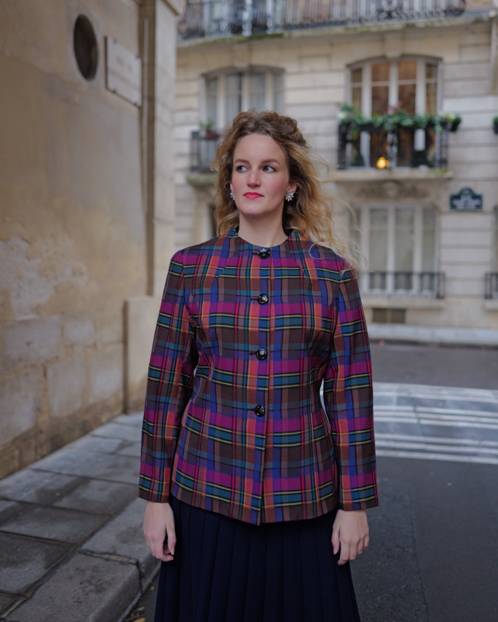 Vintage wool blazer with a checked pattern in beautiful deep colors. The blazer has a tailored fit and a slightly longer length.