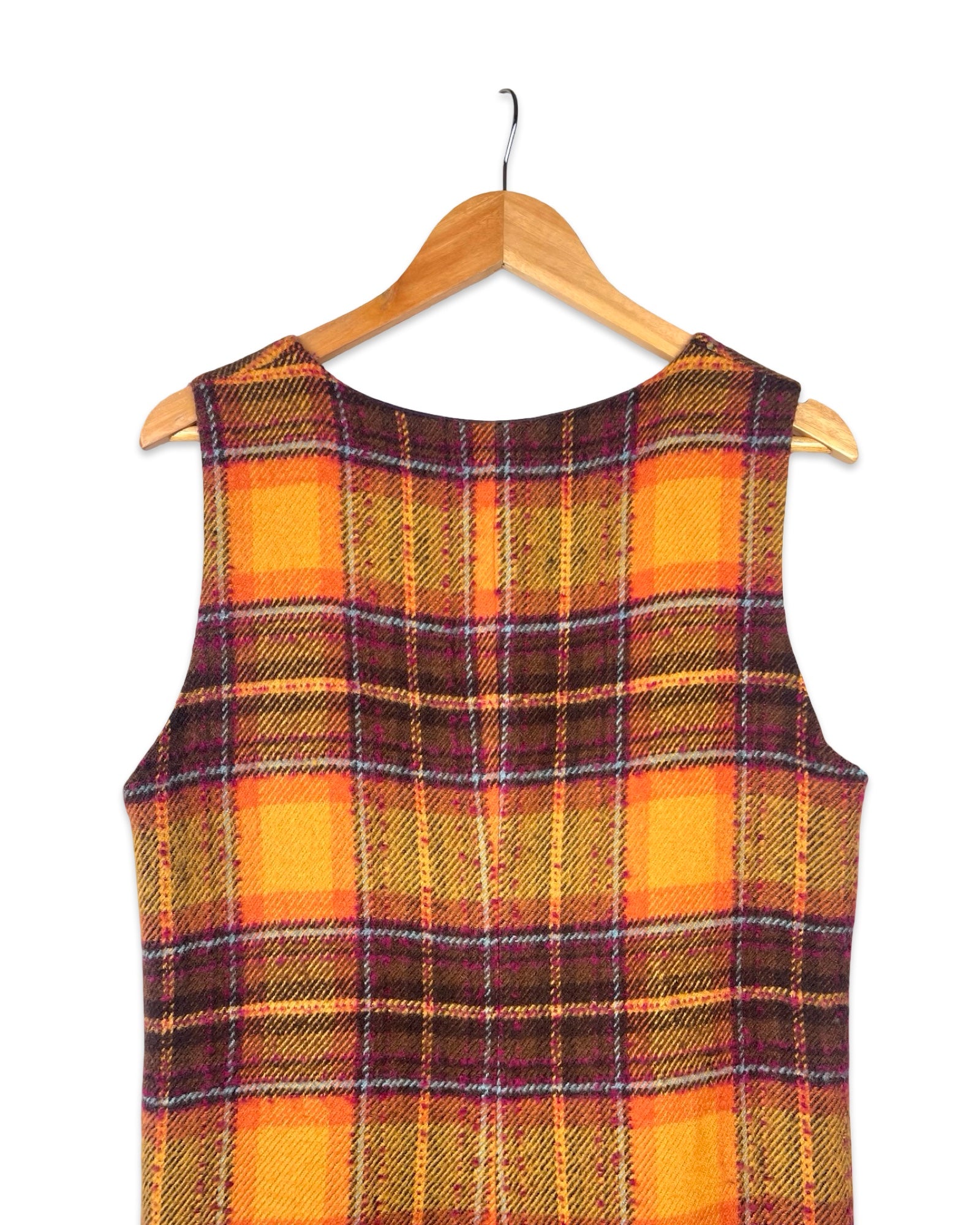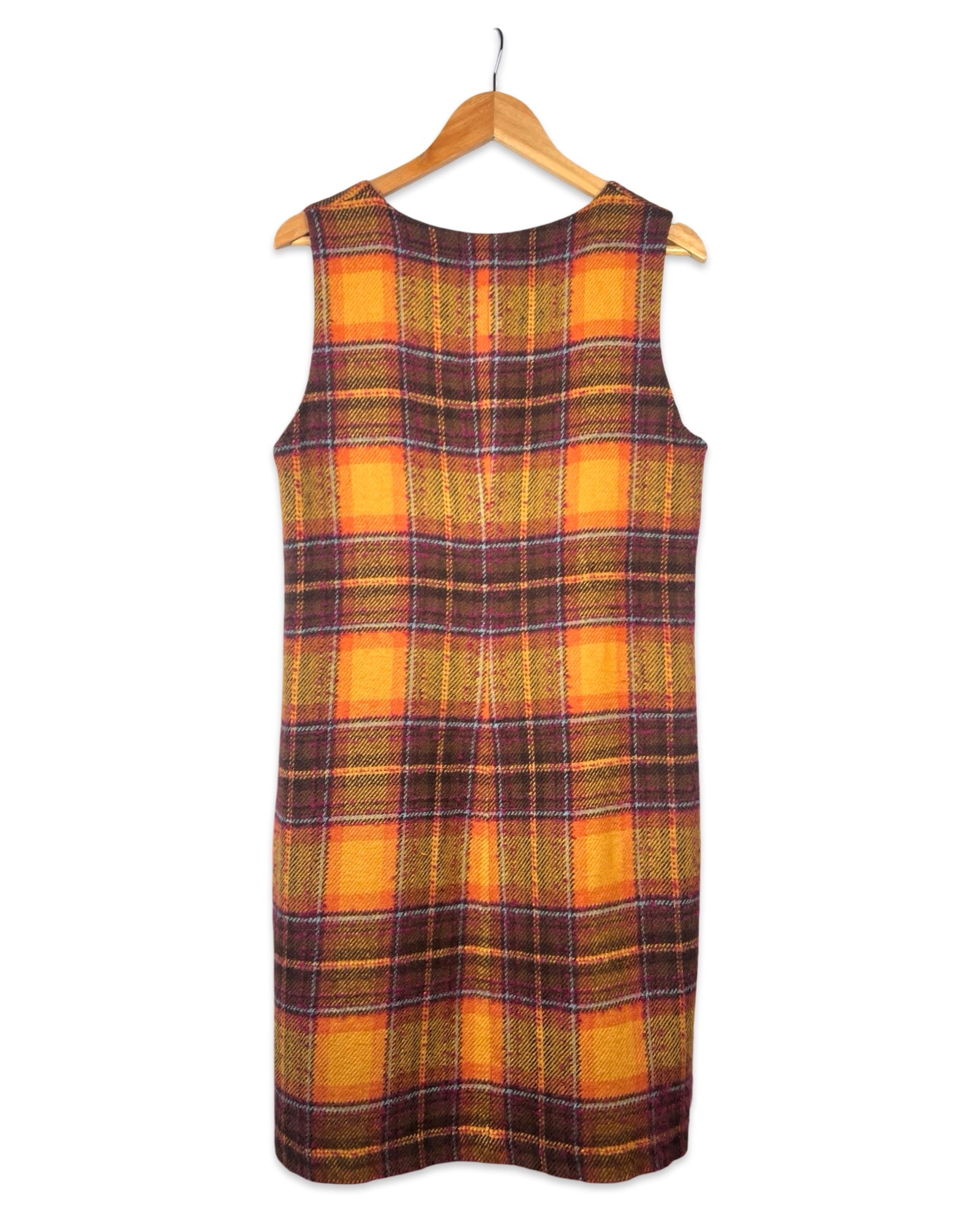 Mouwloze jurk gemaakt van een wollige boucléstof met ruitmotief in warme kleuren. De jurk is voor de foto's aan de achterkant vastgezet om deze passend te laten lijken op het model, maar het is een maat L.