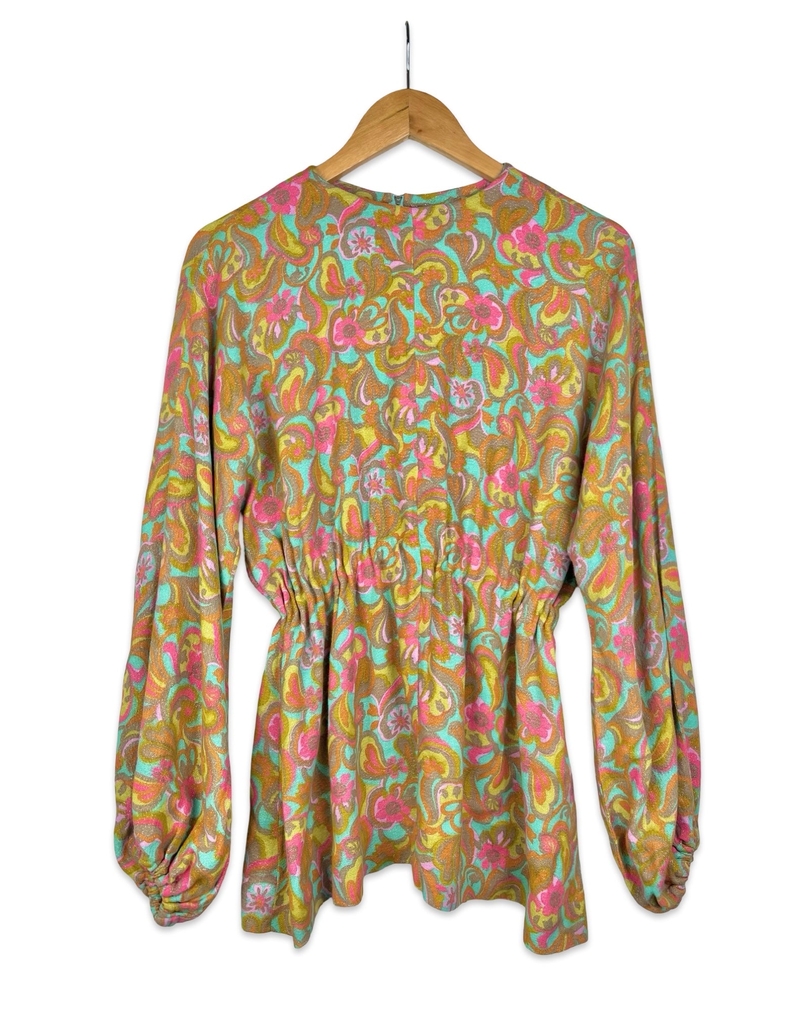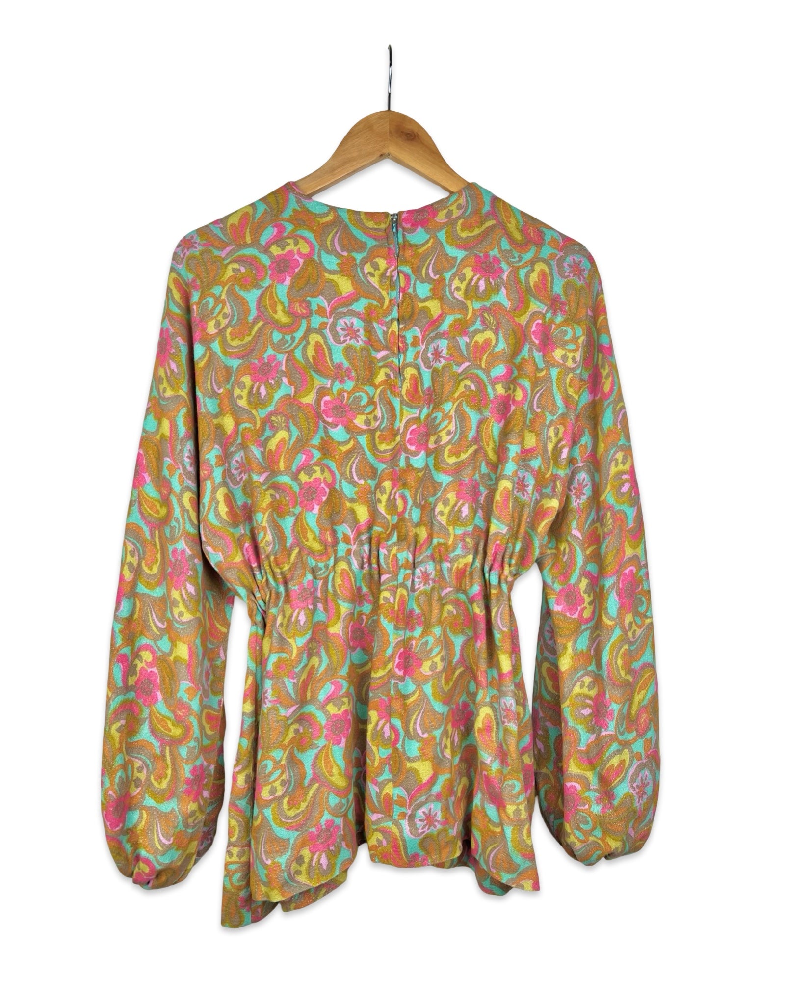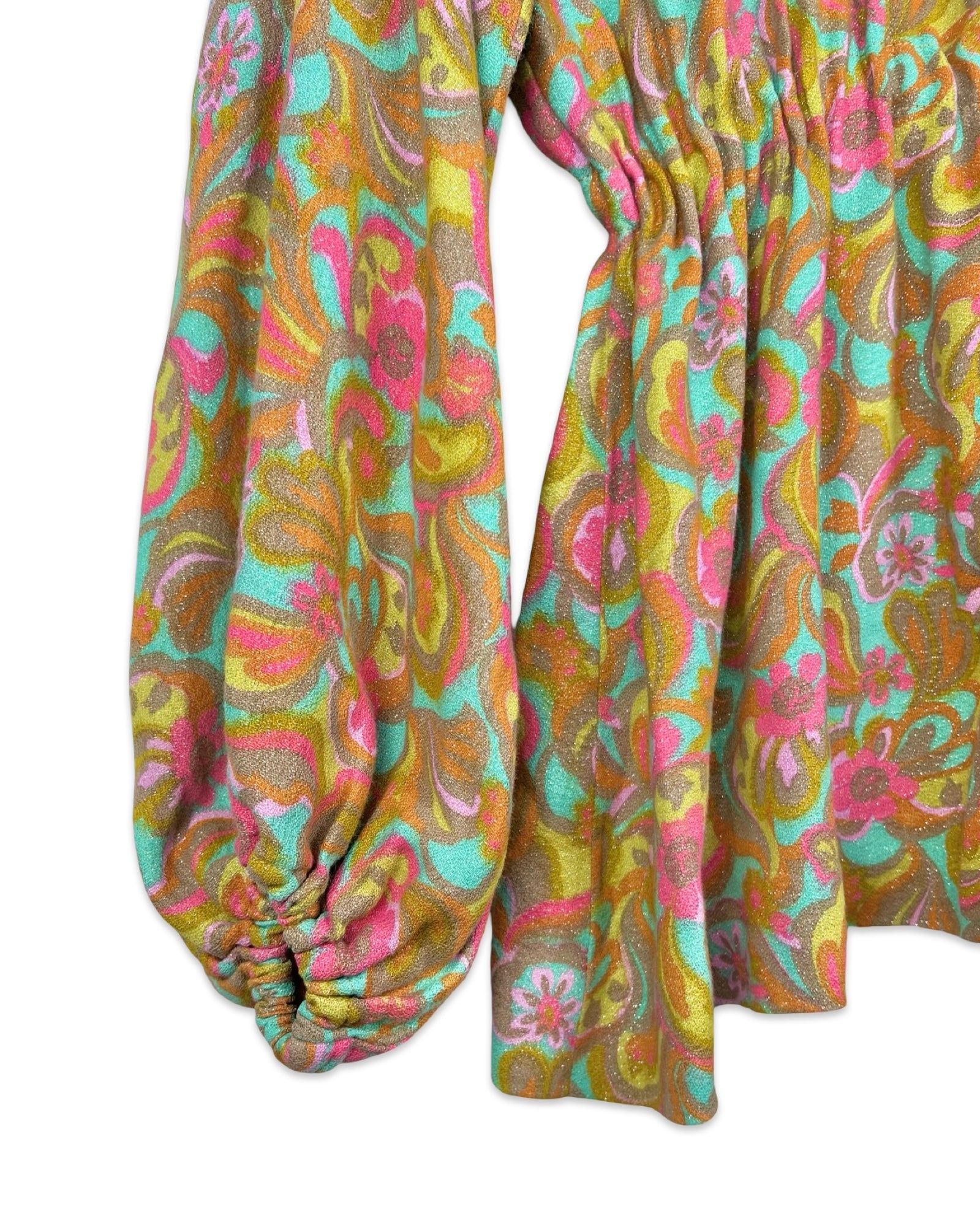 Deze kleurrijke vintage top met retroprint is een echte blikvanger. De top heeft een bijzondere pasvorm door de aangeknipte pofmouwen en de elastische taille. De kleuren zijn prachtig en er zit een subtiele glitter in de stof verwerkt.