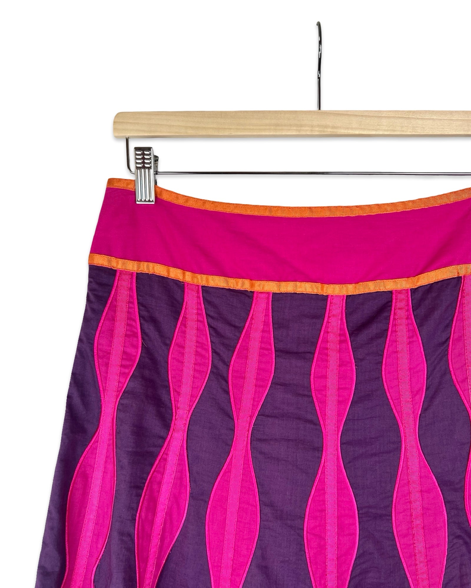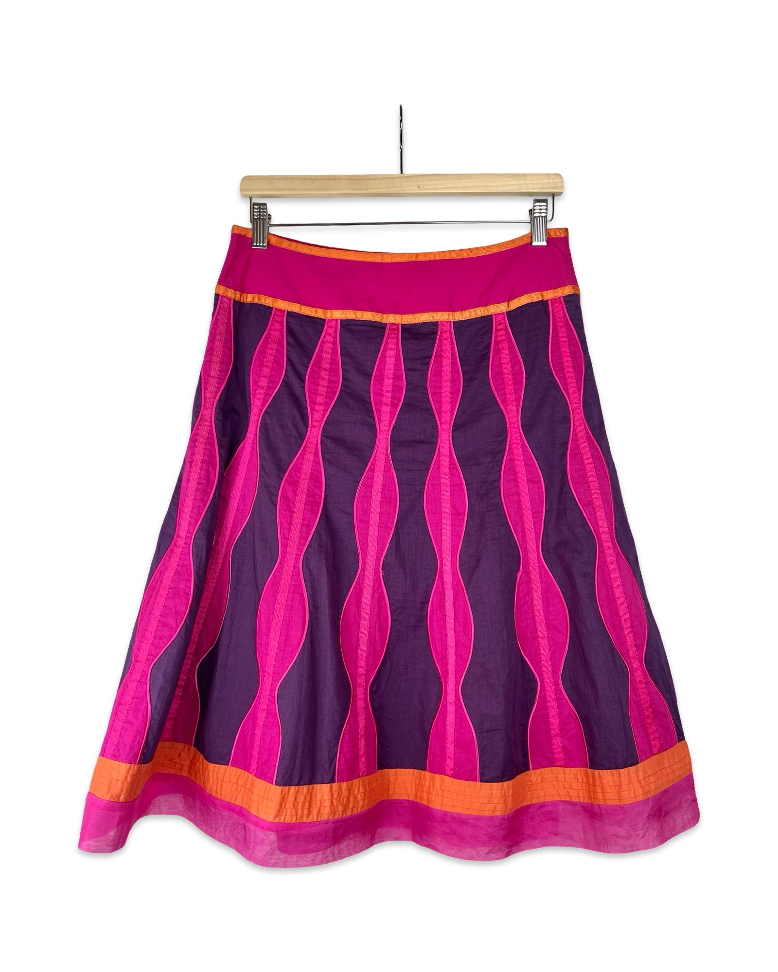 Wijd uitlopende rok met retro swirlpatroon in een prachtige mix van kleuren: paars, roze en oranje. De rok is gemaakt van een katoen-zijde mix.