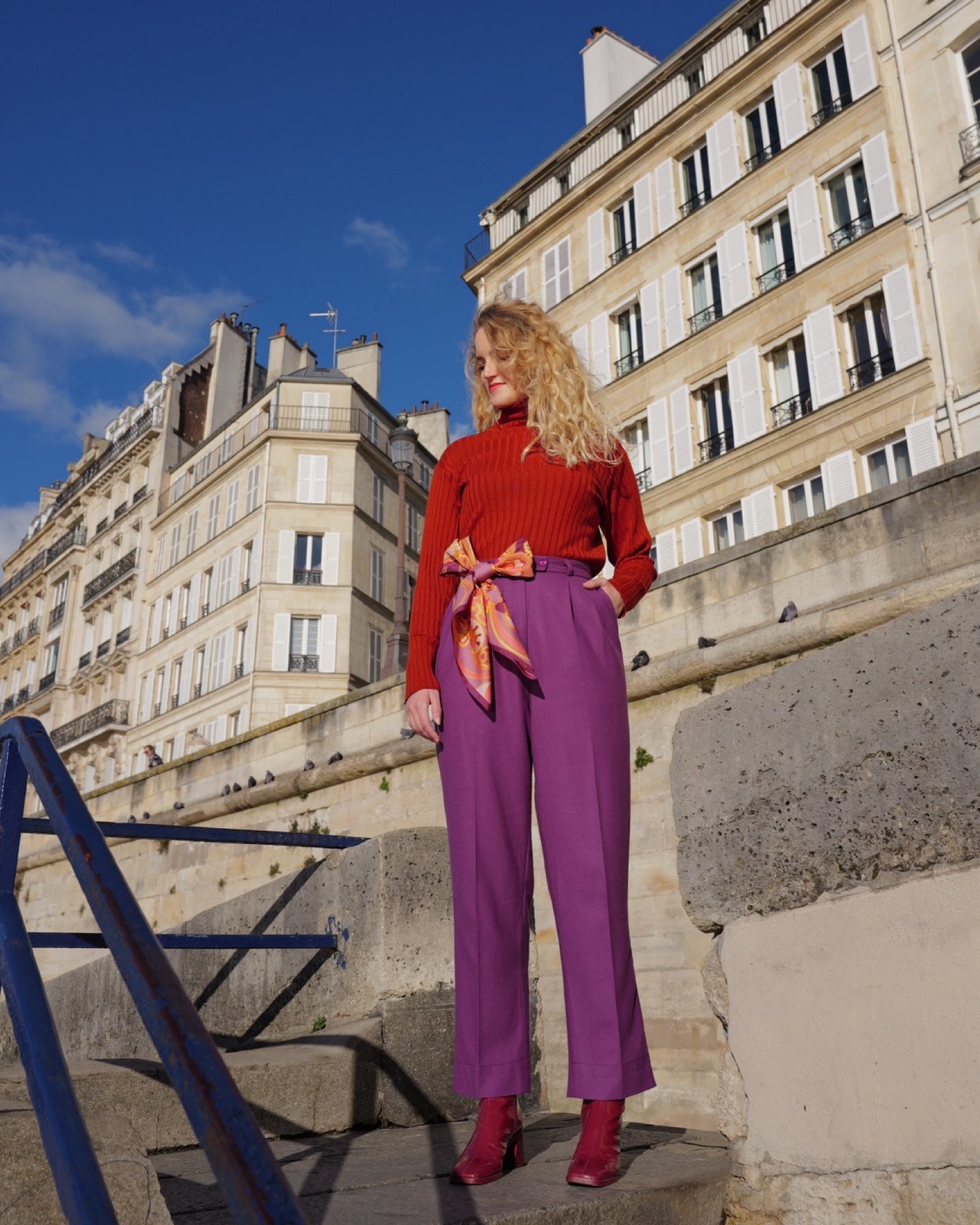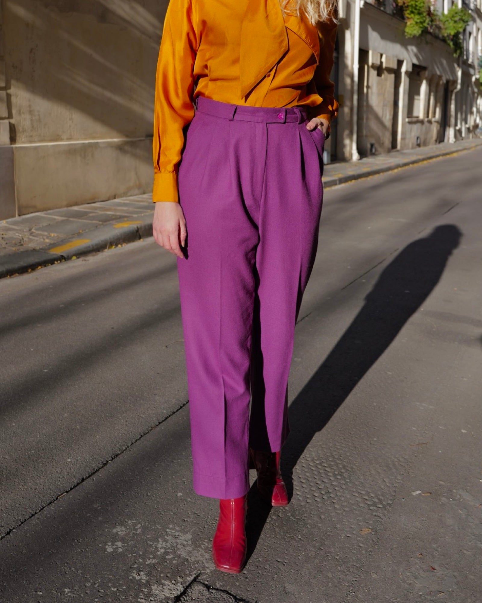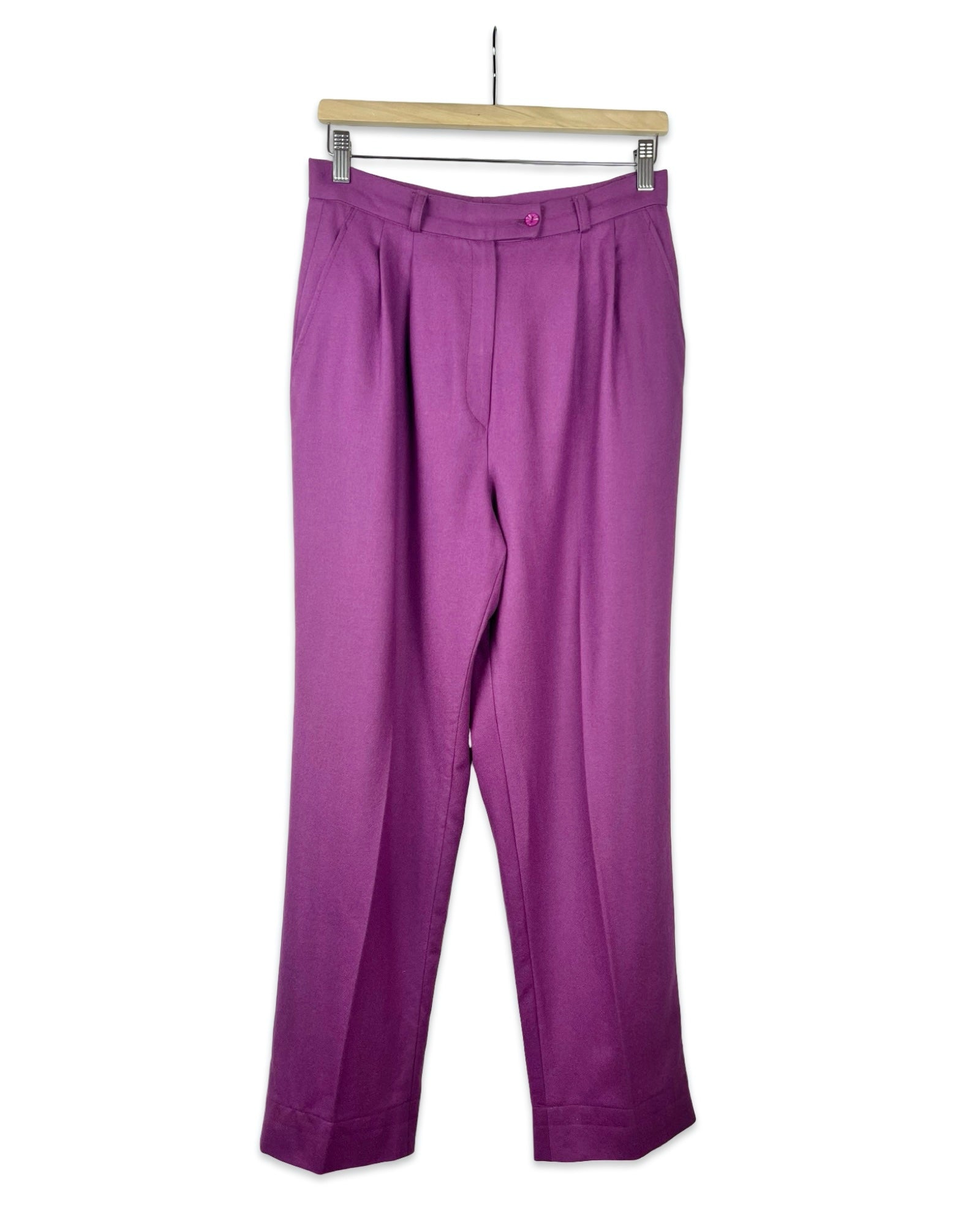 Deze prachtige paarse vintage pantalon met bandplooien en een rechte, iets kortere pijp is handgemaakt van 100% wol. De pantalon valt hoog in de taille en is onderdeel van een pak.