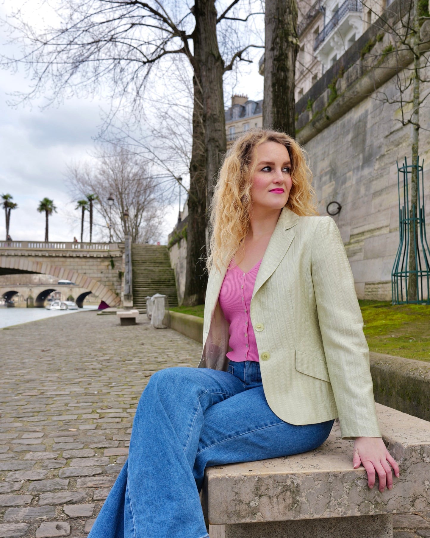 Deze lichtgroene vintage blazer is gemaakt van 100% zijde en heeft een prachtige subtiele glans door de visgraat geweven stof.