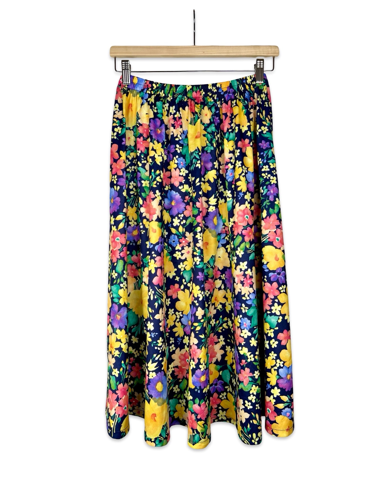 In deze kleurrijke vintage rok met bloemenprint ga je dansend de lente tegemoet 🌼 De rok heeft een midilengte en een klokkende pasvorm met elastiek in de taille.