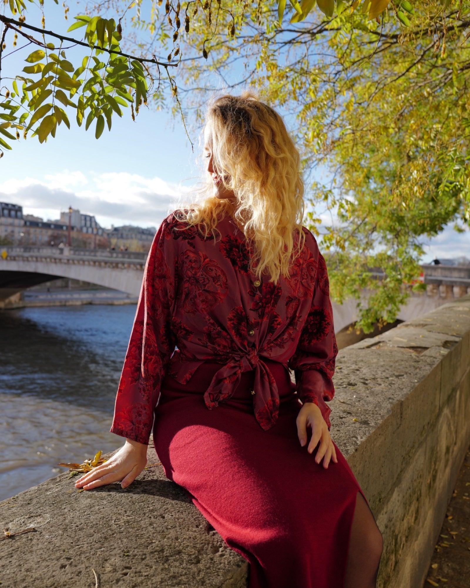 Deze vintage blouse is gemaakt van een prachtige changeant stof waardoor de kleur varieert afhankelijk van hoe het licht er op schijnt. De blouse heeft bijzondere knopen en een barokachtige bloemenprint.