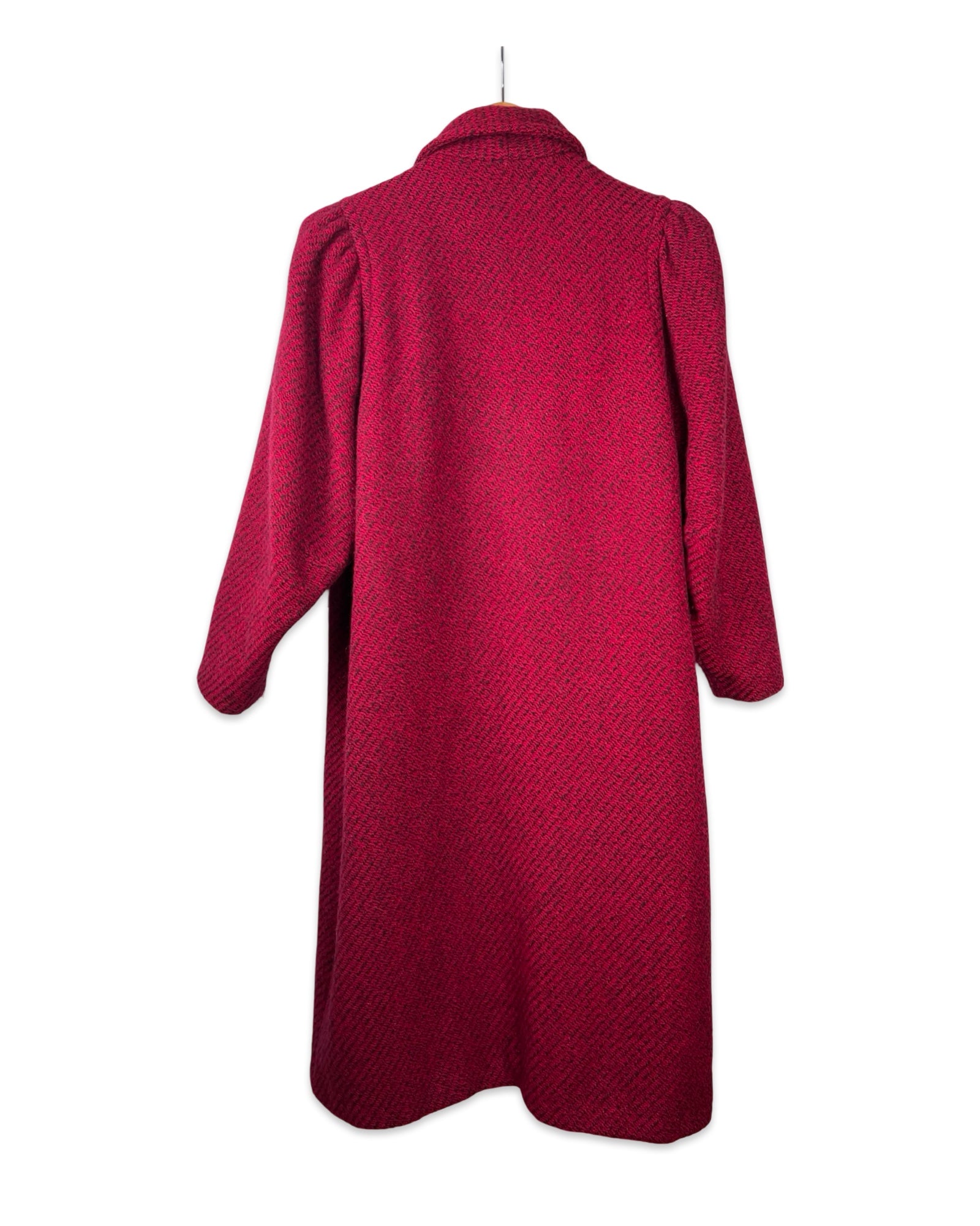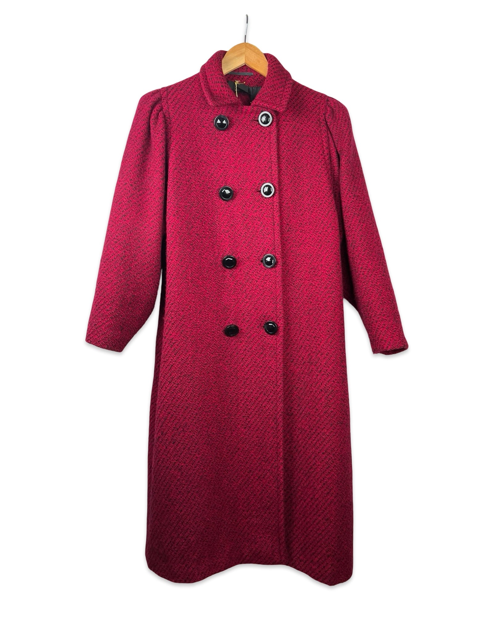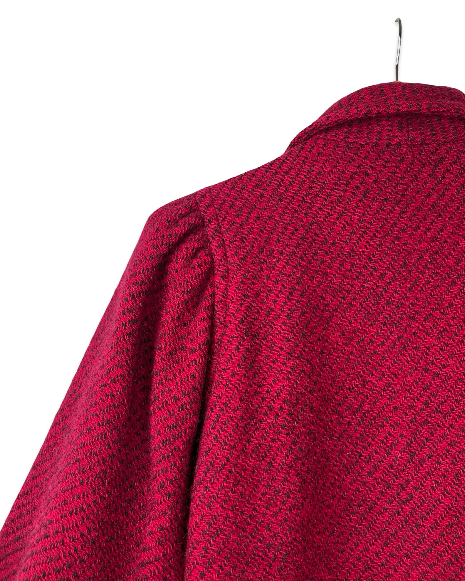 Deze prachtige jaren '80 mantel is een echte showstopper! Gemaakt van een rood/zwart gemêleerde wollen stof, de jas heeft volumineuze pofmouwen en is voorzien van een dubbele rij opvallende knopen.