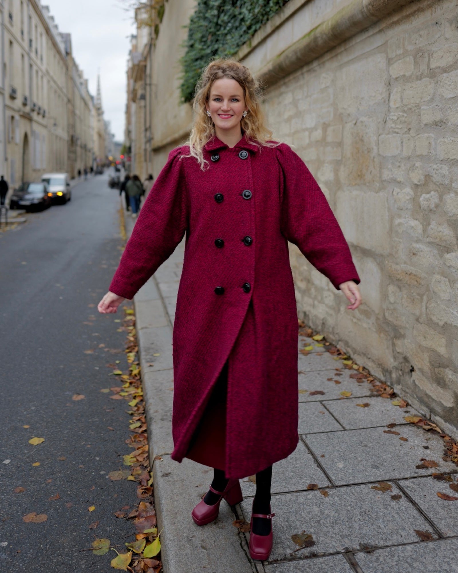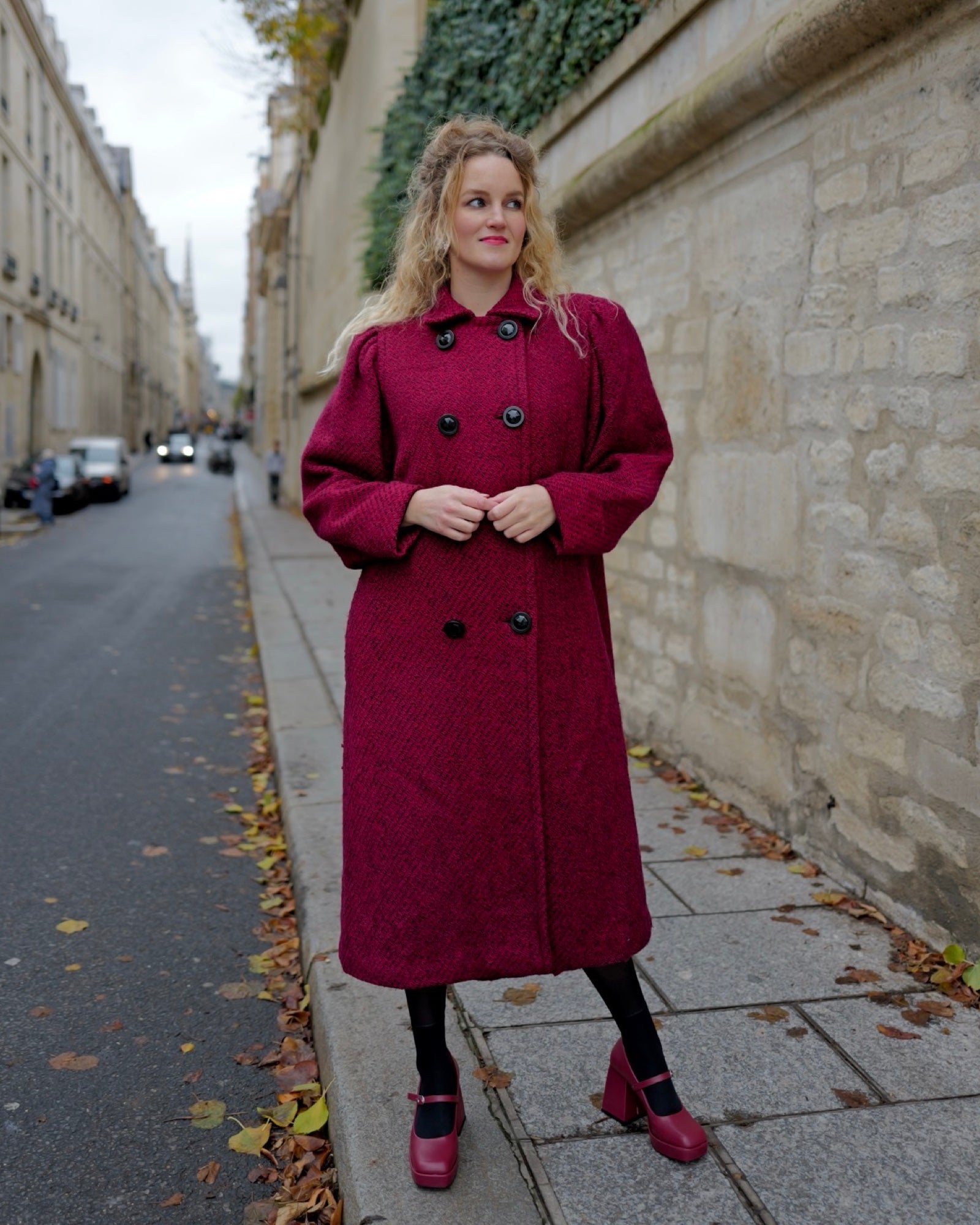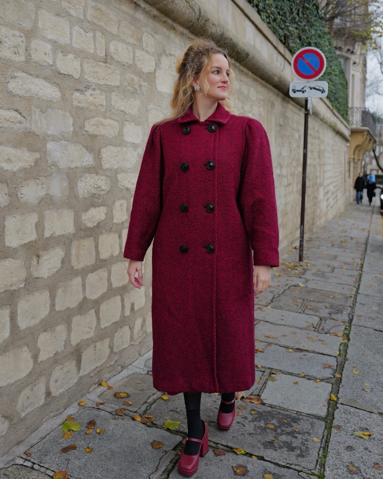Deze prachtige jaren '80 mantel is een echte showstopper! Gemaakt van een rood/zwart gemêleerde wollen stof, de jas heeft volumineuze pofmouwen en is voorzien van een dubbele rij opvallende knopen.