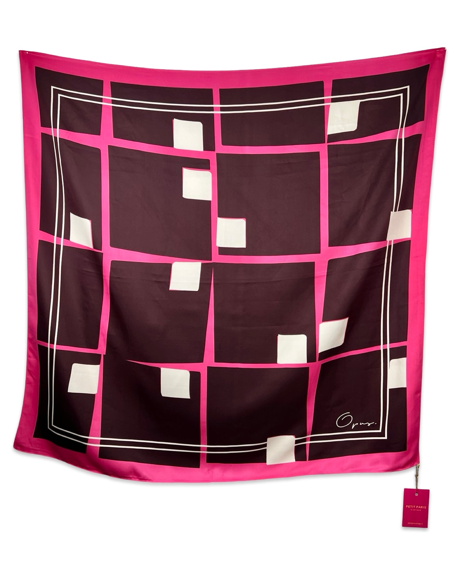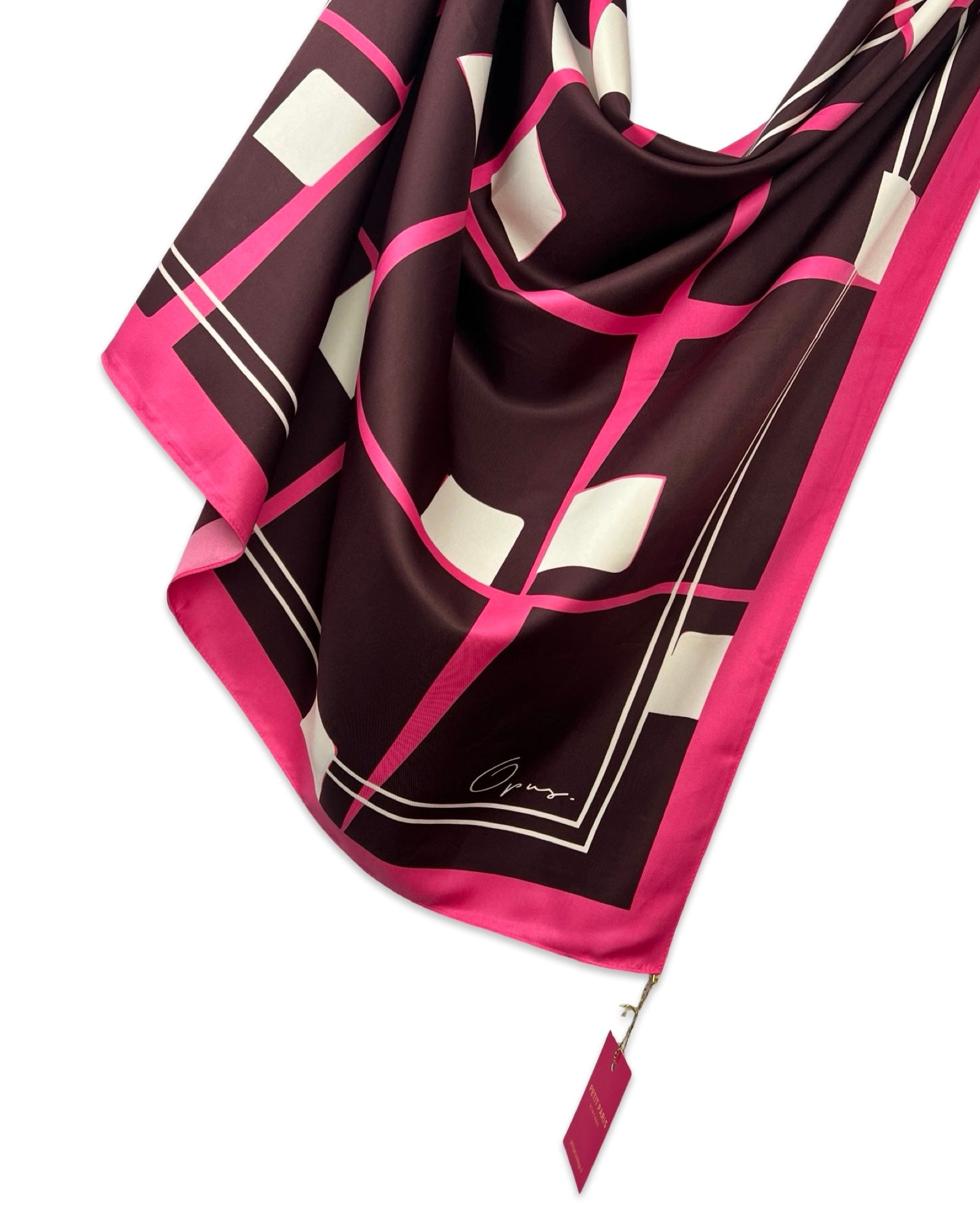 Grote satijnen sjaal van het merk Opus. De sjaal heeft een geometrisch motief in een mooie kleurencombinatie van aubergine, felroze en wit.