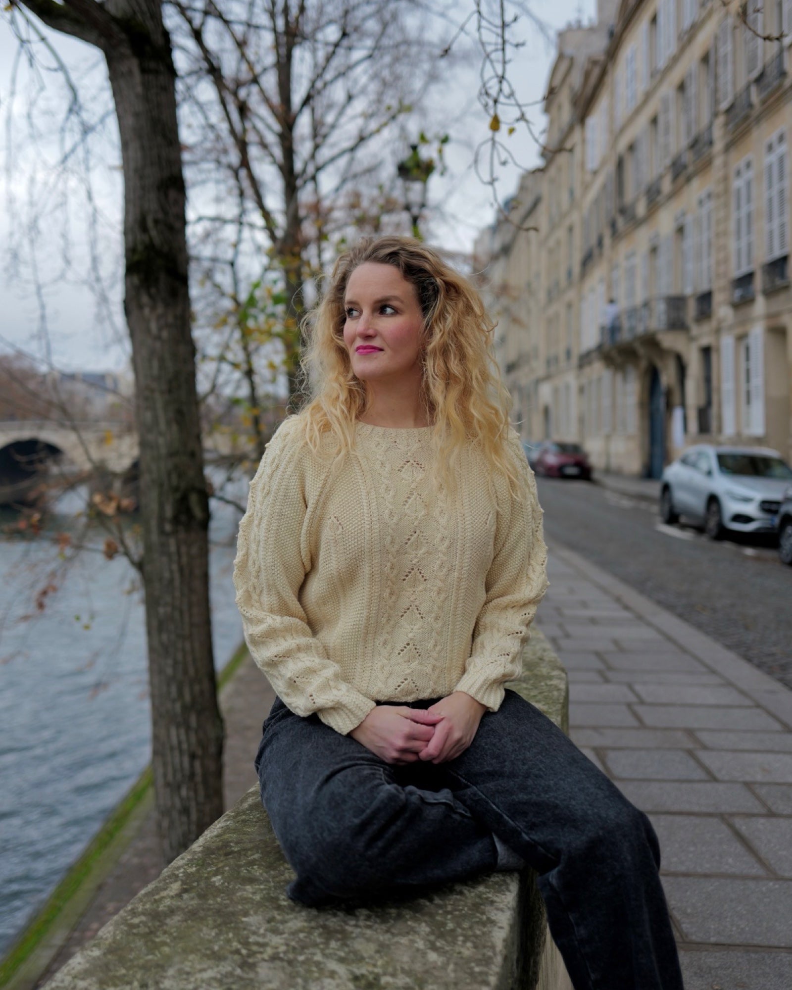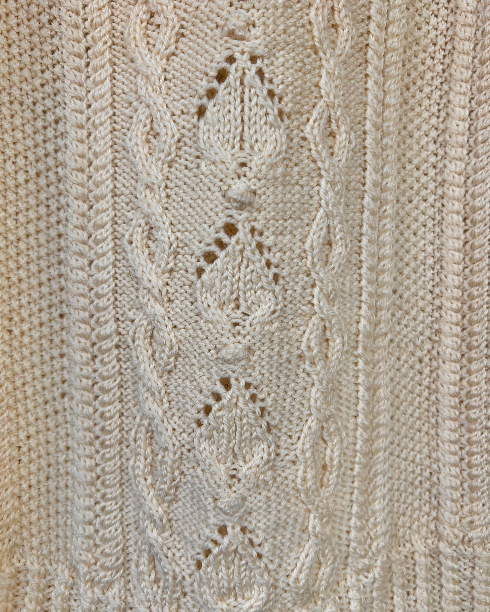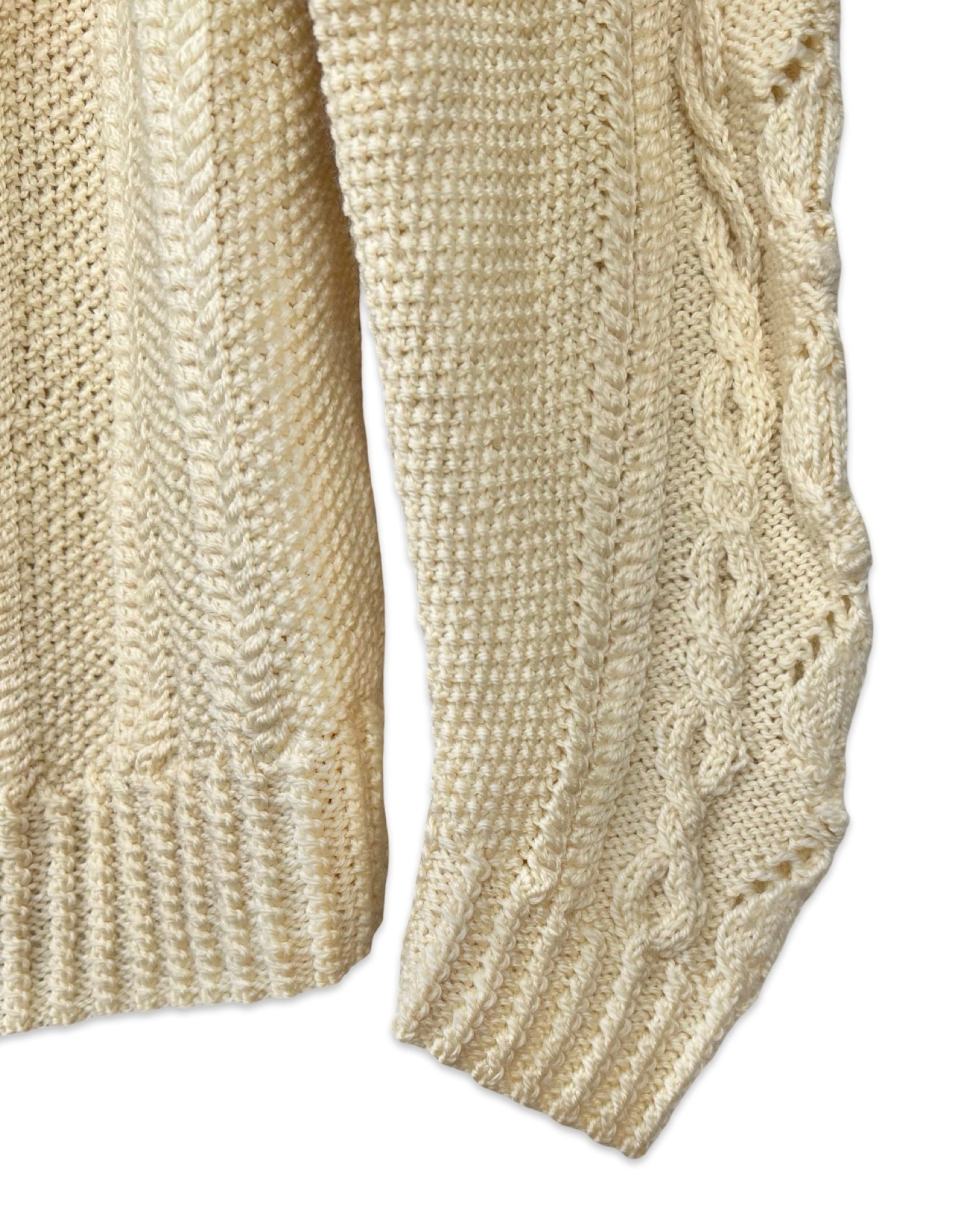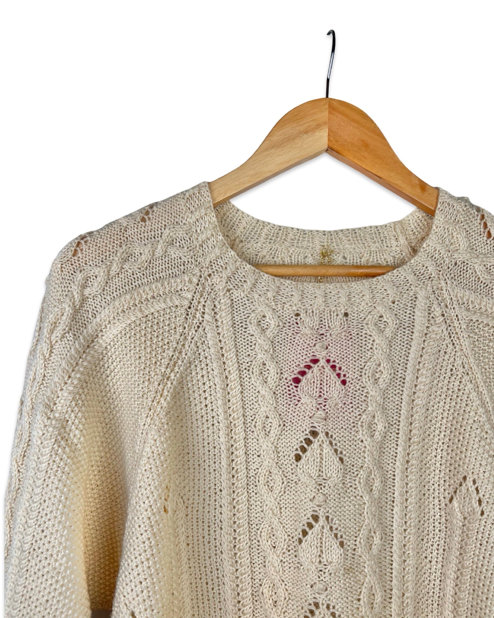 Hele mooie handgebreide vintage trui in warme crèmekleur met kabels. Door de manier van breien is de trui soepel en stretchy maar toch stevig. De mouwen zijn op de bovenarmen en bij de oksels wat ruimer en lopen dan taps toe richting de pols. De trui is gemaakt van wol of een wolmix.